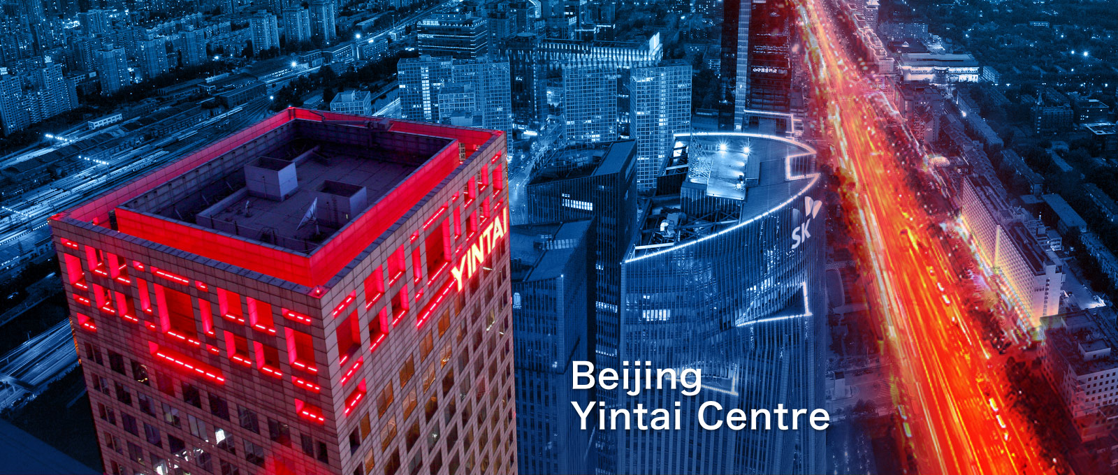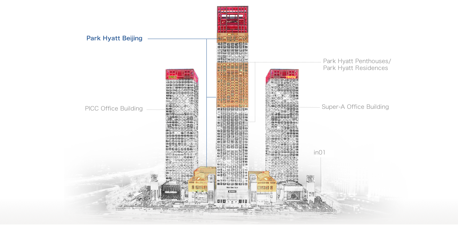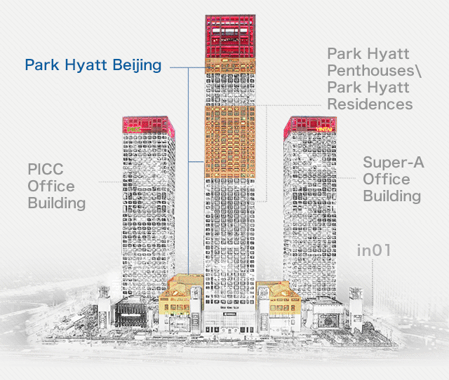 Conveniently located at the southwestern corner of the Gold Cross of the Guomao Bridge as a landmark designed by world-famous architect John Portman & Associates, Inc., the development features three skyscrapers arranged in aninverted tee matrix with the central main tower standing 249.9 meters high, representing the tallest building complex in service so far along the Chang'an Street. The lantern-like frame structure of the glass pyramid at the top shines brilliantly through the darkness in the way a "Chinese lantern lights up the CBD". Comprising Park Hyatt Beijing, proprietary condos Park Hyatt Penthouses, modern apartments Park Hyatt Residences, a high-end shopping mall in01 and two Super-A office buildings, Beijing Yintai Centre is your destination for high-grade business, recreation, health, cuisine and entertainment in its international definition.